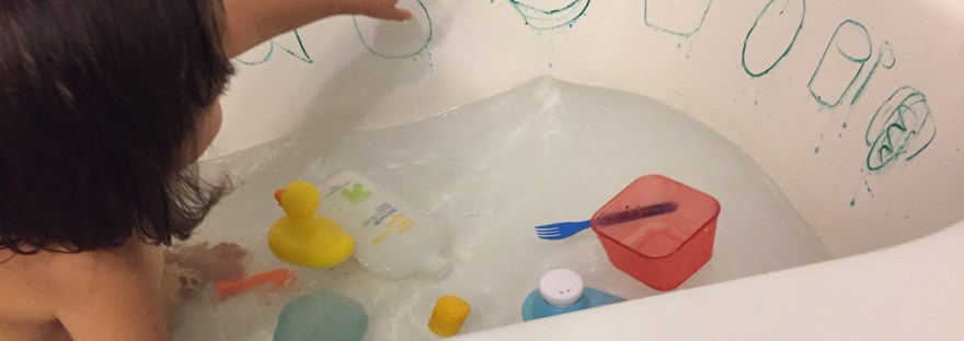 Lately, we’ve been playing a simple game in the bathtub to reinforce what we’ve been learning that week. These are bath crayons by the way, they are suppose to wipe off easily from any bath surface, and my 1-year old son thinks they’re delicious. Anyway, the game is to use bath crayons and draw vocabulary pictures on the side of the tub and call out the vocabulary words. If identified correctly, my daughter wipes the picture away. She likes wiping it away. It appeases the destructive desires in her.