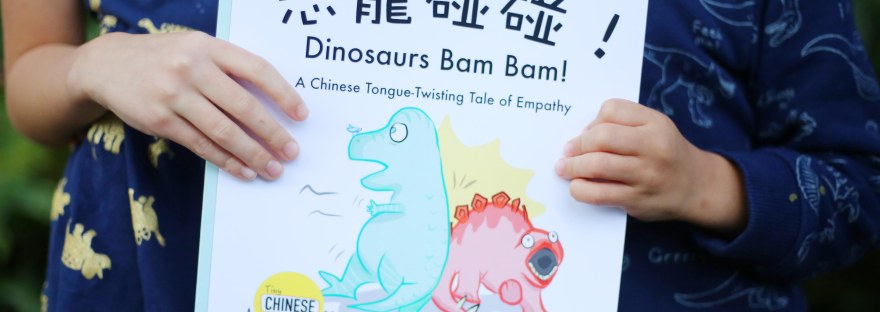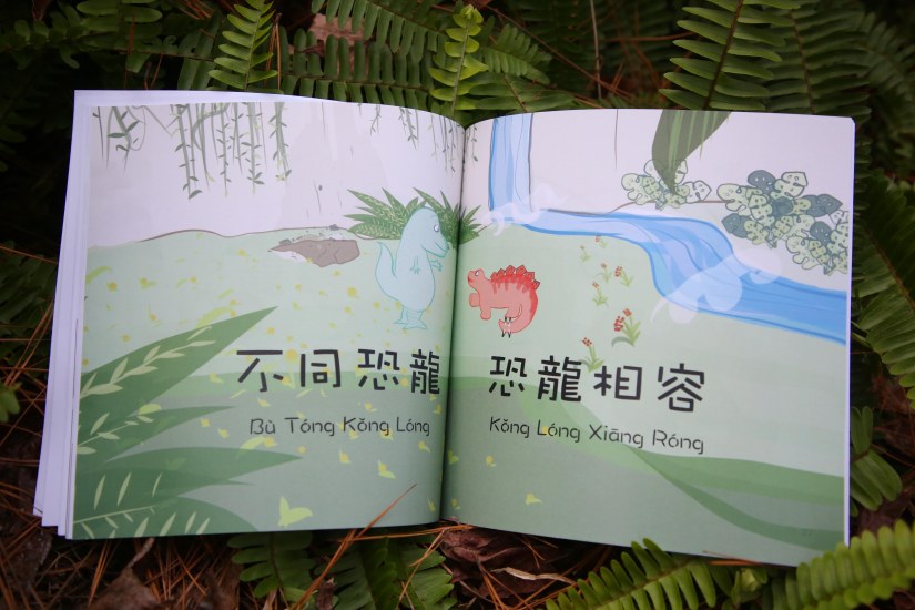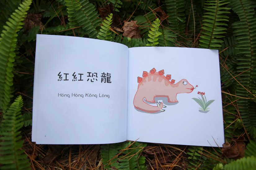The book has simple, colorful illustrations that help explore their dinosaur world. Each page has both Traditional Chinese characters and pinyin romanization–with English translation in the back. After the story, the book includes discussion questions for both old and young to explore how to apply empathy in real life. For those just beginning Chinese, online audio (complete with music and sound effects) are available on this website.