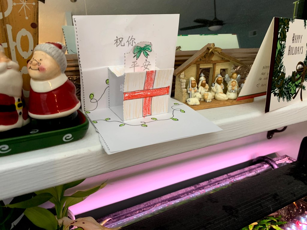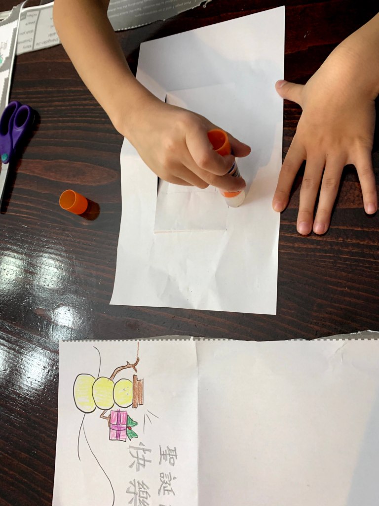Here is a fun craft you can do with your kids to get them excited about Christmas. Often, when Chinese people wish each other a happy holiday, they insert a wish for that person. For example, “新年快樂,年年有餘 / Happy New Year, may you have abundance year after year!” I made a card that embodies that idea of leaving a wish for someone, because what speaks more to Christmas than looking outside yourself and thinking of others.