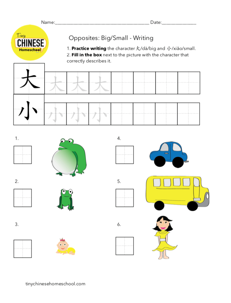 Opposites – Big/Small: This worksheet teaches children two words and focuses on helping them read and write it. Afterwards, the children must apply the principle to different pictures.