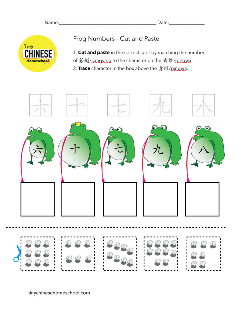 Frog Numbers – Cut and Paste: This worksheet helps young children apply numbers 6-10 through matching. They can also practice writing! This worksheet would be a perfect supplement to Tiny Chinese Homeschool Vol.1 Chapter 9: Numbers