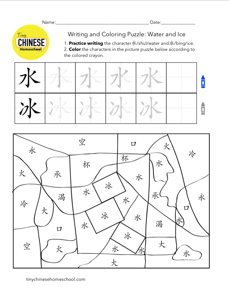 Water and Ice – Writing and Coloring Puzzle: A lot of characters look similar. This worksheet tests the learner if he/she can spot small differences in characters.