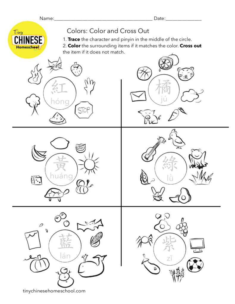 Color – Color and Cross Out: Enjoy this review of 6 Chinese colors! Practice tracing the characters for red, orange, yellow, green. blue, and purple, then circle the items that match the color.