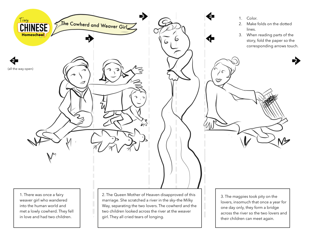 The Cowherd and Weaver Girl: This is a coloring page that tells the story behind the Chinese Valentine’s holiday called 七夕/Qīxī. This page can be folded to hide and reveal parts of the picture according to the story. This printable in available in English, Traditional, and Simplified Chinese.